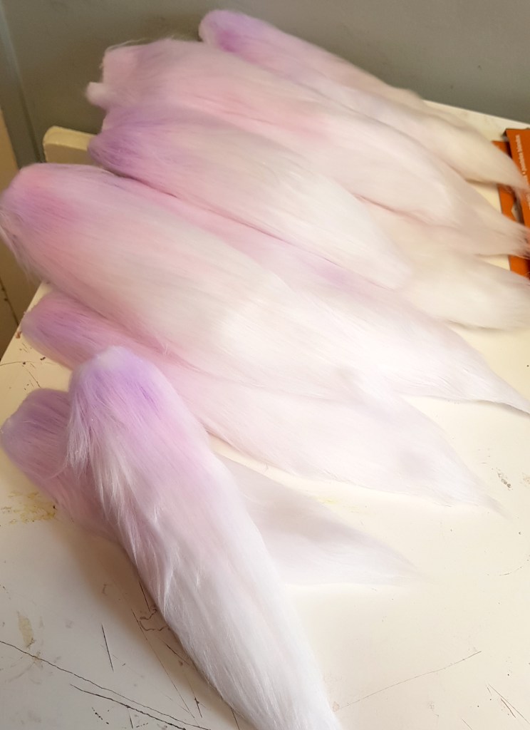 To make the fluffy top of the cape I used cheap furry fabric. I made a tail shaped pattern and filled each piece with wadding. To make the gradient color I used pastel chalks and brushed the hair to blur it. Then sealed it with some hairspray (this also keeps the hair in place but remember to bring the bottle to the conventions because hair can get messy  during the day xD)